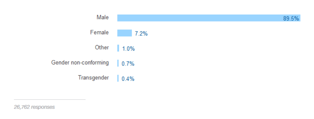 - Information Systems: Since 2001 the Stack Overflow has circulated a questionnaire for program developers to establish parameters of preferences and profiles of professionals. Below are graphs of the 2017 survey, conducted in January with 64,000 developers and showing alarming results of disparity between men and women.